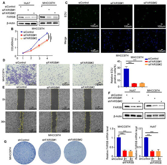 In order to verify the cancer-promoting effect of FARSB in HCC, the FARSB knockdown cell model was constructed by transfecting Huh7 and MHCC97H with siFARSB. The knockdown efficiency was detected by Western blot (Figure 3A). In CCK-8 and EdU experiments, the cell proliferation level of the FARSB knockdown group was suppressed (Figure 3B,C and Figure S1A,B). Transwell and wound-healing assays confirmed that FARSB knockdown significantly suppressed the migration ability (Figure 3D,E and Figure S1C,D). In addition, we constructed shFARSB stable cell lines and verified the knockdown efficiency of FARSB by Western blot and RT-PCR (Figure 3F). Then, the colony formation assay showed decreased clone numbers in the FARSB knockdown group (Figure 3G and Figure S1E). In summary, FARSB can promote HCC progression by promoting proliferation and migration.