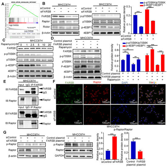 Several studies have confirmed that ARSs regulate mTORC1 signaling pathways [27,28,29]. Therefore, we verified the relationship between FARSB and mTOR signaling pathway. We used gene set enrichment analysis (GSEA) to perform Kyoto Encyclopedia of Genes and Genomes (KEGG) enrichment analysis and found that the mTOR signaling pathway was significantly enriched in the FARSB high expression group (Figure 4A). The core enrichment molecule contained the core component Raptor of mTORC1 and the core component Rictor of mTORC2 (Figure S2A). After siFARSB transfected MHCC97H cells, Western blot showed that the expression level of Raptor decreased after FARSB knockdown, but Rictor did not change significantly, and the activation of mTORC1 was suppressed (Figure 4B). The results showed that rapamycin did not affect the protein expression level of FARSB (Figure 4C and Figure S2B), so we speculated that FARSB was the upstream of the mTORC1 complex. At the same time, we constructed FARSB-stable overexpression cell lines and then treated them with 20 nM rapamycin for 48 h. Western blot results showed that rapamycin could block the effect of FARSB gene overexpression on mTORC1 activation (Figure 4D). Then, the co-immunoprecipitation and immunofluorescence co-localization of FARSB and Raptor were performed in MHCC97H cells. The results showed a physical association between FARSB and Raptor (Figure 4E,F). In addition, Western blot showed that the expression level of Raptor decreased, and the phosphorylation level increased when knocking down FARSB, which suggests that knockdown of FARSB reduced the unphosphorylated Raptor but did not increase the amount of phosphorylated Raptor. In contrast, the expression level of Raptor remained unchanged, but the phosphorylation level decreased when overexpressing FARSB (Figure 4G). Previous studies have shown that increased Raptor phosphorylation level suppresses mTORC1 activation [30]. The above results suggest that FARSB activates the mTORC1 signaling pathway by suppressing Raptor phosphorylation.