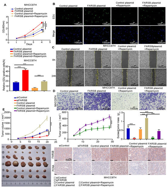 FARSB promotes the proliferation and migration of HCC cells by activating the mTORC1 signaling pathway. (A,D) Overexpression of FARSB and control group MHCC97H cells were treated with 20 nM rapamycin for 48 h. CCK-8 (A) and EdU (B) were used to detect the proliferation of MHCC97H cells. Fluorescent images showing EdU positive cells nuclei (green) and total nuclei in the samples (Hoechst, blue). Wound-healing assay (C) and Transwell assay (D) were used to detect the migration ability of MHCC97H cells. (E) Knockdown or overexpression of FARSB and control group MHCC97H cells were used for the xenograft tumor model in nude mice. Among them, FARSB overexpression and control group mice began on the eighth day; half of the nude mice were injected with normal saline and half were injected with rapamycin (4 mg/kg) for 16 days. The changes in tumor volume were recorded at different time points, and the subcutaneous tumors were removed and weighed. Representative immunohistochemical images showed the expression of FARSB and PCNA in xenograft tumor tissues. Scale: 50 μm, ***: p < 0.001.