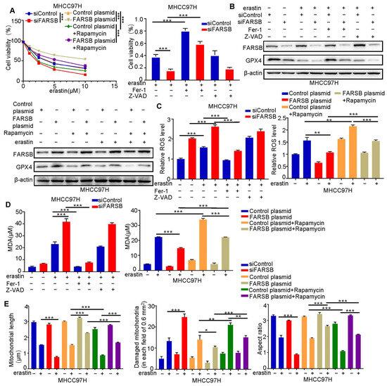 FARSB suppresses ferroptosis in HCC cells by activating mTORC1 expression. (A) Knockdown or overexpression of FARSB (with or without 20 nM rapamycin) and MHCC97H cells in the control group were treated with gradient concentrations (0, 1, 2.5, 5, 10) of erastin to detect cell viability. FARSB knockdown MHCC97H and control cells were treated with 10 μM erastin and then ferrostatin-1 (2 μM) or Z-VAD (10 μM) for 24 h, respectively. Cell viability (B–D) was measured. FARSB knockdown or overexpression MHCC97H cells were treated with 10 μM erastin, with or without ferrostatin-1 (2 μM), Z-VAD (10 μM) and rapamycin (20 nM), respectively. The expression level of GPX4 was detected via Western blot (B). The ROS (C) and MDA (D) levels in each treatment group were detected. (E) The 10 μM erastin-treated MHCC97H cells with knockdown or overexpression of FARSB and MHCC97H cells with overexpression of FARSB (with or without 20 nM rapamycin). The morphology of mitochondria in each group was observed under the electron microscope, and the length of mitochondria, the number of mitochondrial damage and the aspect ratio were counted. *: p < 0.05, **: p < 0.01, ***: p < 0.001.