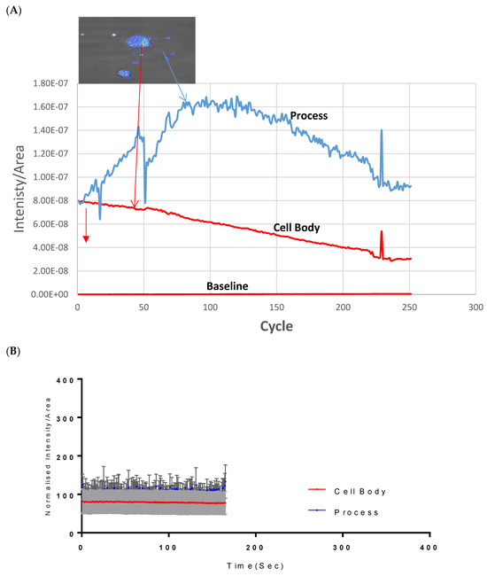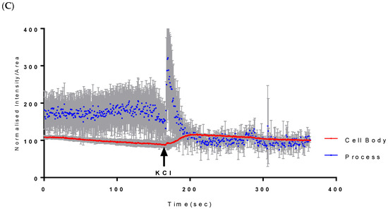 Assessment of both the processes and the cell body of CAD cells showed that at 500 µM, Vanadium elicited a rapid calcium response, especially compared to that of the neuronal cell body, which peaked and dropped steadily to the original level starting concentration at cycle 250, as seen in Figure 1A. Little or no response was observed in the cell body in CAD cells. Figure 1B,C shows the status of calcium ions in the control group and after depolarization with KCl, respectively.