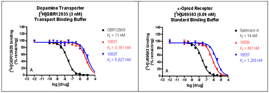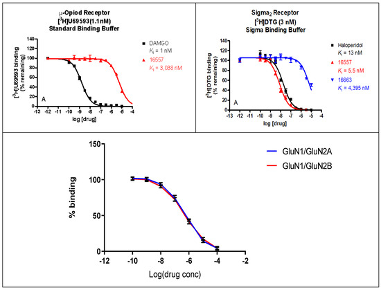 The binding affinities of ZA-II-05 were highest at the sigma 2, KOR, MOR, and DAT receptors, compared to 5HT2A, D1, D2, NET, SERT, and Sigma 1, which had lower binding affinities of over 10,000 nM as seen in Figure 2. GluN 2A and GluN 2B were observed to have affinities within close ranges with a mean IC50 of 5.178 × 10−7 M and 4.289 × 10−7 M, respectively.