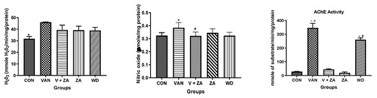 Evaluation of neuroprotective effects of ZA-II-05 using different biochemical markers (H2O2, NO content, protein thiol and non-protein thiol) showed high significance in the activity of AChe compared to other biochemical markers, as seen in Figure 3. The Ache content was significantly (p < 0.05) reduced in the control and compound-treated groups compared to the vanadium and withdrawal groups.