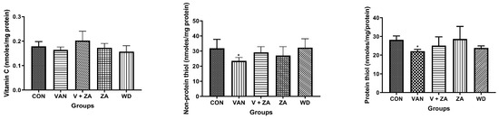 Different brain regions were examined to determine their neuronal vitality and number, and it was revealed that vanadium treatment caused a significant reduction in neuronal count and high levels of pyknosis. A higher number of viable neuronal cells was observed in the control, Van + ZA-, and ZA-treated groups. The nuclei in the vanadium-treated group appear to be pale with high cytoplasmic vacuolations, which was significantly lower (p < 0.05), as seen in all three anatomic regions (PFC, CA1 and CA3) in Figure 5. Interestingly, ZA treatment only seems to show an increased number of neurons in the PFC with high vitality.