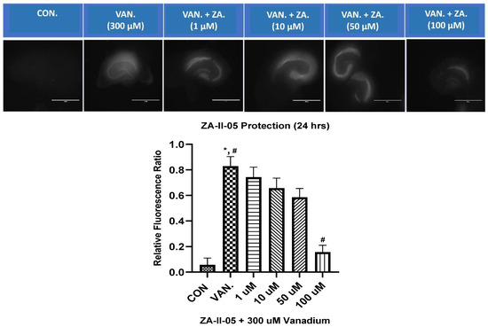 ZA-II-05 was evaluated for its neuroprotective effect against vanadium-induced neurotoxicity at 300 µM. This was performed at different concentrations of ZA-II-O5, as seen in Figure 4. There was a gradual reduction in cell death with increasing concentrations of the compound. Peak protection was achieved at 100 µM at a significant level (p < 0.05) compared to the vanadium (300 µM)-treated hippocampal slices.