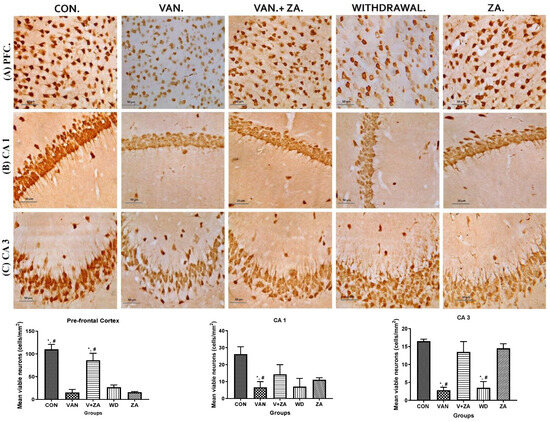 Presents the results obtained from NeuN immunostaining of the prefrontal cortex (PFC), CA 1, and CA 3 hippocampal regions; (A) PFC reveals neurons with no significant abnormalities observed in the cortical sections of the control group. Normal neurons were characterized by rounded and pale nuclei, while degenerating neurons displayed smaller cell bodies with neuropil vacuolation and significantly higher pyknotic nuclei compared to the control group. The ZA-II-05 group exhibited significantly less cellular pathology in the prefrontal cortex compared to the vanadium-exposed groups, indicating a potent protective effect against vanadium-induced damage; (B) CA1 region shows progressive loss of apical dendrites in the pyramidal cells of the dorsal hippocampus after vanadium treatment. ZA-II-05-treated group displayed a reversal effect relative to the vanadium-exposed group, suggesting a mitigation of the dendritic loss; (C) CA3 region revealed neuronal degeneration in the pyramidal cells after vanadium exposure. The vanadium-treated group exhibited morphological alterations in cortical pyramidal cells, including cytoplasmic vacuolation, cell clustering, pyknosis, and loss of layering pattern, compared to the control and ZA-II-05 treated groups, which displayed normal neuronal morphology. The ZA-II-05-treated group showed a reversal effect with reduced cellular toxicity. Interestingly, ZA-II-05-treated group decreased viable cells in CA1 but increased neuronal number and vitality in the prefrontal cortex. The symbol * indicates a significant difference compared to the control group at p < 0.05, while the symbol # indicates a significant difference compared to the vanadium + ZA-II-05 (V+ZA) group at p < 0.05. Vanadium was administered at a dose of 100 mg/kg, and ZA-II-05 was administered at a dose of 100 mg/kg. Abbreviations: CON for control, VAN for vanadium, ZA for ZA-II-05, and WD for withdrawal. Magnification: ×400. Scale bar: 50 μm remains consistent across the rows.