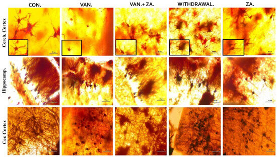 In our observations, we noted significant reductions in dendritic length and alterations in the granule cells of the vanadium-treated groups. Specifically, we observed smaller, sparser, and less elaborate dendritic arborizations, with limited or absent apical and basal dendrites in the hippocampus, cerebral, and cerebellar regions of the mice brains (Figure 6). Coadministration of ZA-II-05 successfully reversed these dendritic changes induced by vanadium neurotoxicity by a significant amount. Notably, the treatment resulted in increased dendritic lengthening and branching and enhanced arborization compared to the vanadium-treated group.