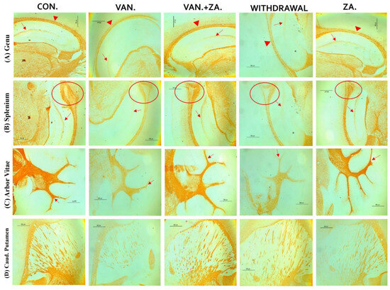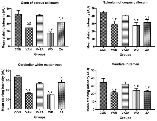 Histopathological examination of vanadium-exposed brains exhibited evident myelin damage compared to the control group. Demyelination was observed in the fibers of the genu, splenium, arbor vitae, and the caudate putamen regions of mice brains, accompanied by a reduced density of myelin tracts. The myelin pallor appeared uniformly depleted, as seen in Figure 7. Control and ZA-II-05-treated groups showed significantly higher expression of myelin content and preservation of axonal dendritic integrity in the deep cortical layers (p < 0.05) compared to the vanadium-treated group.