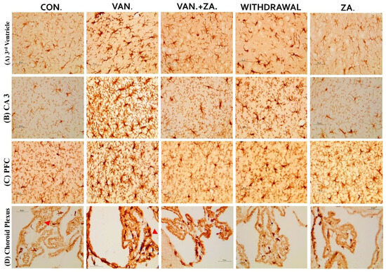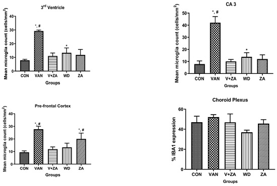 Recent studies have focused on recognizing microglia as a potential therapeutic target for pharmacological interventions in different neurological disorders [62]. In the vanadium-treated group, we observed microglial activation in the CA 3 region of the hippocampus, choroid plexus, and the third ventricle of the brain. Environmental toxicants are known to readily trigger their activation [27]. The activated microglia displayed cellular hypertrophy, and their processes exhibited a bushy appearance. The degree of microglial activation was higher in the vanadium-treated group, indicating that vanadium-induced oxidative stress led to the production of free radicals (Figure 9). However, in the group treated with ZA-II-05, a noticeable decrease in microglial activation was observed, which was potentially attributed to its capacity to regulate glutamate signaling, thereby reducing excitotoxicity and inhibiting excessive calcium influx.