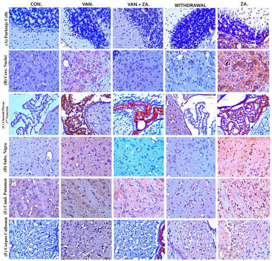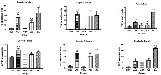 Evaluation of tumor necrosis factor-alpha (TNF-α) in different brain regions: Purkinje cells (A), Cerebellar nuclei (B), Choroid plexus in the third ventricle (C), SN (D), Caudate putamen (E), Corpus callosum (F). Notice the increased expression of TNF-α in the groups treated with vanadium in the mentioned brain regions compared to the control and ZA-II-05 groups. The treated groups consistently downregulated TNF-α expression significantly (p < 0.05) in the substantia nigra, corpus callosum and caudate putamen. Interestingly, treatment with ZA-II-05 only upregulated the expression of TNF-α significantly (p < 0.05) in all the brain regions compared to the other groups.