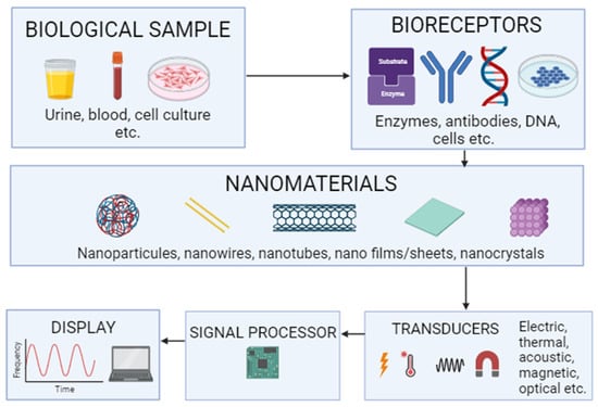 Nano-biosensors, combined with biological elements (enzymes, antibodies, and nucleic acids) and sensitive detection platforms, convert biomolecular interactions into measurable signals [111]. They can be applied in biomedical engineering as medical diagnostic devices. In general, nano-biosensors can be classified based on their material components, the specific targets they detect, and the signals they use to transmit information [112]. Bioreceptors and transducers are their main components (Figure 2). Bioreceptors comprise biomolecules that detect biochemical interactions or the analyte [113]. The transmission of the biological signal as an electrical signal is carried out by the transducer, which can be calorimetric, potentiometric, amperometric, or optical, among others [114]. More specifically, biochemical signals are converted into electrical signals due to the interaction of the bioreceptor with the analyte [115].