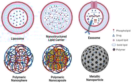 Nanotechnology can be used for drug delivery systems to vectorize drugs or other bioactive compounds directed to specific cellular or molecular targets. Within the various nanosystems designed for encapsulating bioactive compounds and facilitating drug delivery, noteworthy examples are lipid nanoparticles, such as liposomes and exosomes, nanostructured lipid carriers, polymeric nanoparticles, such as polymeric nanocapsules and nanospheres, and metallic nanoparticles, such as iron, gold and silver nanoparticles (Figure 3). The small particle size associated with using biodegradable materials makes nanoparticles a great delivery vehicle since they can significantly increase the solubility and bioavailability of the actives in biological fluids, facilitating drug uptake by cells and penetration through biological barriers [130,131,132].