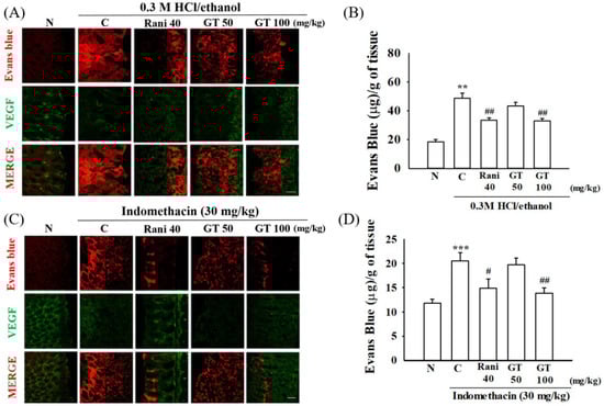 Evans blue is a fluorescent dye that specifically binds to albumin in the plasma. Therefore, Evans blue staining is commonly used to assess vascular permeability []. In this study, we used vascular endothelial growth factor (VEGF) as a gastric blood vessel marker []. When Evans blue was injected into a vein through the orbital plexus, the amount of gastric Evans blue increased in the group treated with 0.3 M HCl/ethanol or indomethacin and gastric blood vessels also were damaged with loss of blood vessel forms (p = 0.005, Cohen’s d = 2.0 and p = 0.0004, Cohen’s d = 2.5, respectively) (Figure 3A,C). However, the amount of Evans blue decreased in the gintonin treatment group compared to in the 0.3 M HCl/ethanol or indomethacin alone group (p = 0.003, Cohen’s d = 2.0 and p = 0.003, Cohen’s d = 2.1, respectively) (Figure 3B,D). In particular, the gintonin (GT 100)-treated group showed a trend similar to that of the ranitidine-treated group (p = 0.004, Cohen’s d = 2.1 and p = 0.024, Cohen’s d = 1.5, respectively), in which the blood vessels were close to those of the normal group. These results indicated that administration of 0.3 M HCl/ethanol or indomethacin caused gastric vascular damage and that gintonin administration protected gastric blood vessels (Figure 3B,D). These results also showed that gintonin administration prevented gastric ulcers and gastric blood vessel damage induced by 0.3 M HCl/ethanol or indomethacin.