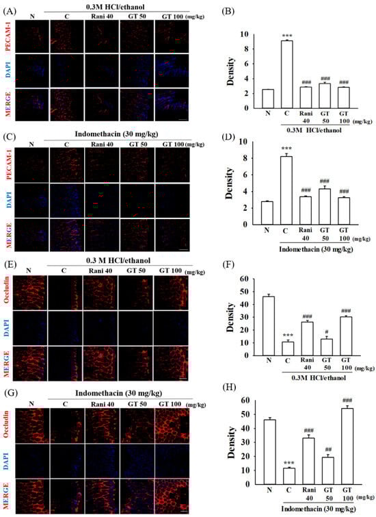As mentioned earlier, the gastric ulcer was induced by 0.3 M HCl/ethanol or indomethacin, and prepared gastric tissue sections were used. We removed the paraffin from the tissue sections attached to the slides. The slides were placed on a rack and the next wash was performed: xylene 3 min 2 times→100% ethanol and xylene 1:1 mixture 3 min→100% ethanol 3 min→95% ethanol 3 min→70% ethanol 3 min→50% ethanol 3 min→wash with cold 1×PBS. We added Tris-EDTA buffer (10 mM Tris Base, 1 mM EDTA solution, 0.05% Tween 20, pH 9.0) to the vessel containing the slide rack and incubated overnight in a 60 °C water bath. The next day, we washed the slides twice for 5 min with gentle agitation of TBS and 0.025% Triton X-100. Incubated for 2 h with the addition of 1% BSA (dissolved in TBS) at room temperature to block non-specific binding. After 2 h, 1% BSA was removed using a tissue. Tissue sections (n = 4 per stomach, 4 stomachs per group) were incubated with rabbit anti-vascular endothelial growth factor-A (VEGF-A) (1:500; Abcam, Cambridge, MA, USA), and rat antiplatelet endothelium, cell adhesion molecule, PECAM-1 (1:500; Santa Cruz Biotechnology, Santa Cruz, CA, USA) and mouse anti-occludin (1:500; Invitrogen, Waltham, MA, USA). The humid box is closed carefully by its lid and kept overnight at 4 °C on a flat balanced surface without agitation. The next day, we rinsed with 2 × 5 min TBS 0.025% Triton with gentle agitation. Cyanine 3 (Cy3) and fluorescein isothiocyanate (FITC)-conjugated immunoglobulin G (IgG) antibodies (1:500; Jackson ImmunoResearch, West Grove, PA, USA) as secondary antibodies. We applied fluorophore-conjugated secondary antibody to the slide diluted to the concentration recommended by the manufacturer in TBS with 1% BSA and incubated for 1 h at room temperature. After 1 h, we washed 3 times with 1×PBS for 5 min. Place the coverslip on the tissue section and circle the edges of the coverslip with clear nail polish to prevent the cells from drying out. We set up a negative control to ensure binding to the specific target protein. Images from each slice were captured capitalizing confocal imaging system (LSM 5 PASCAL; Carl Zeiss, Oberkochen, Germany) and their intensity was quantified. DAPI (4′,6-diamidino-2-phenylindole) (1:1000; Thermo-Fisher Scientific, Waltham, MA, USA) was used as counterstaining.