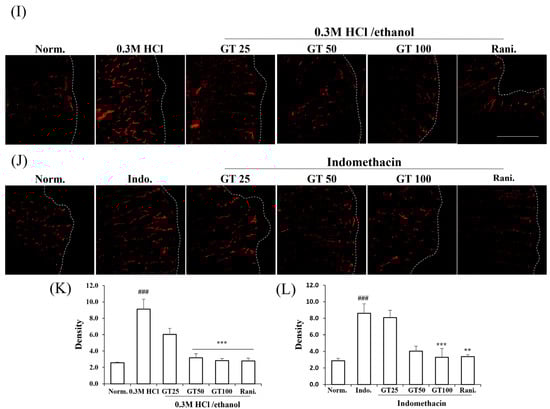 H&E staining is widely used for the recognition of various tissue types and morphological changes under normal and abnormal conditions for observing a wide range of cytoplasmic, nuclear, and extracellular matrix features []. Administration of 0.3 M HCl/ethanol or indomethacin caused damage to the mucosal layer of the gastric tissue (Figure 2A,B). However, when gintonin or ranitidine was administered before gastric ulcer induction, the damage to the mucosal layer due to gastric ulcers was reduced in a dose-dependent manner (Figure 2A,B). In particular, the gintonin (100 mg/kg, GT 100)-administered group demonstrated a tissue shape similar to that of ranitidine-treated gastric ulcers.