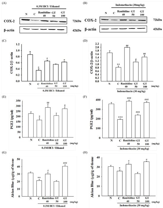 The drugs (ranitidine 40 mg/kg, GT 50 or 100 mg/kg) were administered 1 h before gastric ulcer induction. After induction of gastric ulcer from 0.3 M HCl/ethanol for 1 h and indomethacin at 30 mg/kg for 12 h, ICR mice (8-week-old male mice) were sacrificed by cervical dislocation. The gastric tissue was excised, opened along the larger curvature, and washed with a cold sucrose (0.25 M) solution dissolved in distilled water. The tissue was weighed, placed in 10 mL of Alcian blue (0.1%) solution (Sigma-Aldrich Korea, Gangnam, Republic of Korea), and incubated at room temperature for 2 h. After 2 h, the solution was mixed with an equal volume of diethyl ether and centrifuged at 3000 rpm for 15 min. The solution obtained by centrifugation (100 μL) was added to a 96-well plate to read the absorbance at 605 nm using a microplate reader (Molecular Devices, San Jose, CA, USA). The Alcian blue content was calculated using a standard curve of Alcian blue (0, 0.1, 0.3, 1,3, and 10 μg/mL), and the results were expressed in μg of Alcian blue/g of tissue.