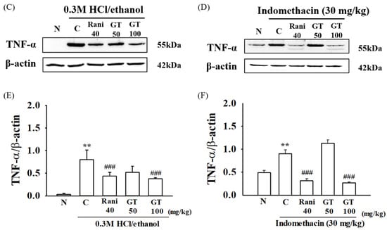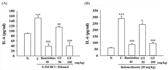 IL-6 and TNF-α are cytokines and representative cell-signaling proteins associated with inflammatory reactions and increase during inflammatory reactions. Elevated IL-6 and TNF-α levels are known to be closely related to the development of various immune abnormalities, inflammatory diseases, and lymphatic tumors []. Therefore, we subsequently checked whether gintonin administration can attenuate inflammatory reactions under insults of 0.3 M HCl/ethanol and indomethacin; we examined the effects of gintonin on the expression level of IL-6 and TNF-α after 0.3 M HCl/ethanol and indomethacin treatment. As shown in Figure 6A,B, treatment of 0.3 M HCl/ethanol or indomethacin significantly increased IL-6 (p = 0.000009, Cohen’s d = 2.6 and 0.0000009, Cohen’s d = 7.6, respectively) and TNF-α (p = 0.002, Cohen’s d = 8.2 and 0.004, Cohen’s d = 4.6, respectively) in the ulcer group in the stomach tissues compared to the normal group (N). However, gintonin and ranitidine treatment attenuated the amount of IL-6 expression by 24 ± 3.8% with 50 mg/kg gintonin (p = 0.0015, Cohen’s d = 1.4 and 0.043, Cohen’s d = 1.3, respectively), 74 ± 12.6% with 100 mg/kg gintonin (p = 0.000003, Cohen’s d = 4.7 and p = 0.000009, Cohen’s d = 6.2, respectively), and 75 ± 9.5% with ranitidine (p = 0.000004, Cohen’s d = 5.1 and p = 0.000001, Cohen’s d = 6.7, respectively).