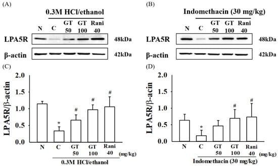 Effect of gintonin on lysophosphatidic acid (LPA)5 receptor expression in gastric ulcer-induced mice. The expression of gastric LPA5 receptor (LPA5R) protein was detected by Western blot analysis. (A) Mice were treated with gintonin (50 mg/kg, GT 50), gintonin (100 mg/kg, GT 100) or ranitidine (40 mg/kg) for 1 h and then treated with 0.3 M HCl/ethanol for 1 h. (B) Mice were treated with gintonin (50 mg/kg), gintonin (100 mg/kg) or ranitidine (40 mg/kg) for 1 h and then treated with indomethacin for 12 h. (C,D) The summary histograms on Western blotting as a LPA5R/β-actin ratio at each dose. The data are expressed as the mean ± standard error of mean (n = 5). * p < 0.05 compared to the normal group; # p < 0.05 compared to the control group.