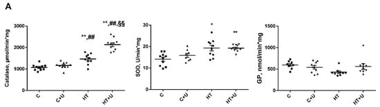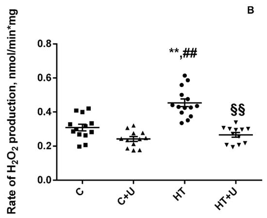| HT + U | 5.6 ± 0.3 **, ## | 51.4 ± 1.3 **, ## | 7.2 ± 0.3 **, ## | 47 ± 1.6 | 7.2 ± 0.2 **, ## | 2.9 ± 0.03 §§ |