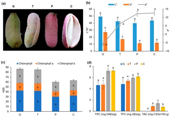 The phenotypes and physiological traits of A. trifoliata fruits during ripening. (a) The A. trifoliata fruit in four developmental stages. G: Green period, T: Transition period, P: Purple period, C: Cracking period. (b–d) The changes in color profile, chlorophylls content, and phytochemical profile of A. trifoliata fruit. Different superscripts in the same color column indicate significant differences at the p < 0.05 level. TPC: Total polyphenol content, TFC: Total flavonoid content, TAC: Total anthocyanin content, GAEs: gallic acid equivalents, QEs: Quercetin equivalents, C3Gs: cyanidin-3-O-glucoside equivalents. All sample analyses were conducted in triplicate.