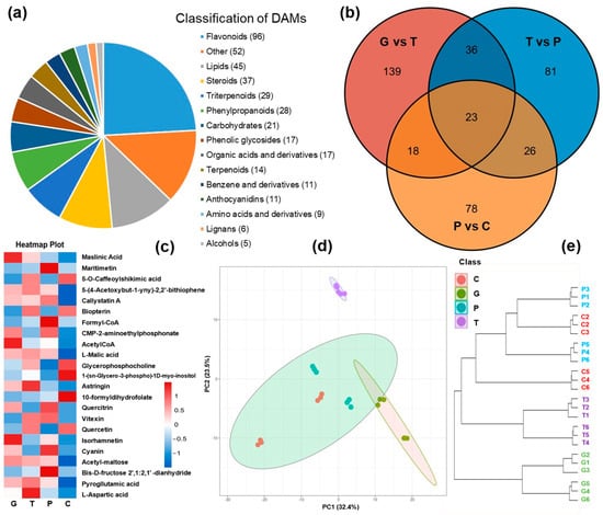 The metabolome analyses of A. trifoliata peels during ripening. (a) The classification of differentially accumulated metabolites (DAMs). (b) Venn diagram of DAMs. G: Green period; T: Transition period; P: Purple period; C: Cracking period. (c) Heat map of the common DAMs. The red segments indicate a relatively high expression level of DAMs, while the blue segments indicate a relatively low expression level of DAMs. (d,e) PCA score plot and dendrogram plot of DAMs. Metabolome analyses of all samples were conducted with six independent biological replicates.