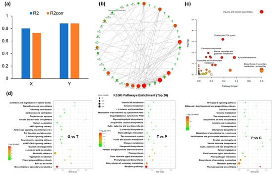 The integrated analyses of transcriptomics and metabolomics. (a) Overview plot of O2PLS integration performance. (b) The co-expression analysis of DEGs and DAMs based on Pearson correlation. (c–d) KEGG enrichment analysis of DAMs and DEGs. The vertical axis shows the top 20 enriched KEGG pathway terms. The size and color of the circle indicate the number of genes and p values of the enriched term, respectively. G: Green period, T: Transition period, P: Purple period, C: Cracking period.