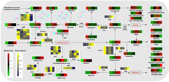 Regulatory network of phenylpropanoid biosynthesis of A. trifoliata peels during ripening. Differential metabolites are marked on the network in bright green (indicating down-regulation) and bright red (indicating up-regulation), and the heat maps above represent the G (green period), T (transition period), P (purple period), and C (cracking period) from left to right. The full name of each enzyme abbreviation is PAL, phenylalanine ammonia-lyase; ANS, anthocyanidin synthase; F5H, ferulate-5-hydroxylase; CHS, chalcone synthase; F3′5′H, flavonoid 3′,5′-hydroxylase; FLS, flavonol synthase; CYP73A, trans-cinnamate 4-monooxygenase; F3′M, flavonoid 3′-monooxygenase; HCT, shikimate O-hydroxycinnamoyl transferase; 4CL, 4-coumarate-CoA ligase; CAD, cinnamyl alcohol dehydrogenase. Metabolome and transcriptome analyses of all samples were conducted with six and three independent biological replicates, respectively.