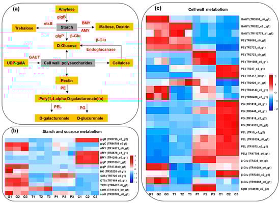 Simplified scheme of the polysaccharide metabolism pathway (a) and heat map diagram of the expression patterns for DEGs annotated for the starch and sucrose metabolism (b) and the cell wall analyzed metabolism (c) by KEGG. G: Green period, T: Transition period, P: Purple period, C: Cracking period. The red segments indicate a relatively high expression level of genes, while the blue segments indicate a relatively low expression level of genes.