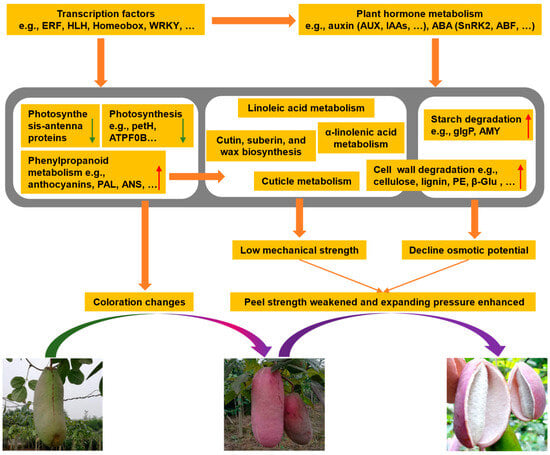 Scheme of the preliminary molecular mechanisms underlying the cracking of A. trifoliata fruits. The red and green arrows indicate the trend of changes in the color of A. trifoliata peel.