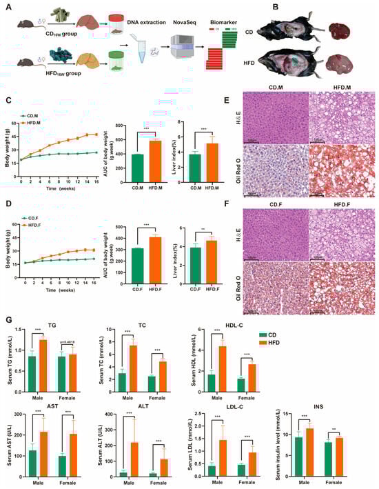 Six-week-old specific pathogen-free C57BL/6 mice (male, 18 to 20 g) (female, 15 to 18 g) were housed in an appropriate temperature-controlled room (22 ± 2 °C) with a 12 h light–dark cycle (ON at 8:00 a.m., OFF at 8:00 p.m.). After one week of feeding, mice were randomly selected and divided into four groups: male CD group, female CD group (n = 10, chow diet, CD), male HFD group, and female HFD group (n = 10, high-fat diet, HFD) (Figure 1A). The experimental mice were fed a refined high-fat diet (XTHF60), which contained 20% carbohydrate, 20% protein, and 60% fat with a total energy of 5.24 kcal/g, and the CD group was fed a refined chow diet (XTCON50J), which contained 70% carbohydrate, 20% protein, and 10% fat with a total energy of 3.85 kcal/g. All experimental mice had free access to food and water. The physical activity, food and water consumption, and feces of the experimental mice were observed daily. HFD and CD were purchased from Jiangsu Xietong Pharmaceutical Bio-engineering Co., Ltd. Nanjing, China.