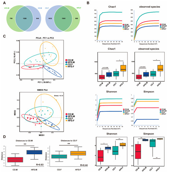 Beta diversity analysis is used to examine changes in the overall structure of the gut microbiota. Principal Coordinate Analysis (PCoA) based on Bray–Curtis distance allows for the observation of dissimilarities between individuals or populations. In addition, non-metric multidimensional scaling (NMDS) was used to reveal non-linear structural relationships within ecological data across samples through representing bacterial community structure as points in a multidimensional space. PCoA and NMDS revealed that the distribution regions for gut samples from CD.M and HFD.M were separated in the two-dimensional coordinate system; however, the distribution regions for gut samples from CD.F and HFD.F partially overlapped (Figure 2C). Anosim analysis was performed to test whether group differences were significantly greater than within-group differences, with results indicating significant differences between groups (R > 0, p < 0.001) (Figure 2D). These results indicated that under normal conditions, female mice had an increased gut microbiota richness compared to male mice. Under HFD, male HFD mice showed an increase in gut microbiota richness, whereas female HFD mice showed a decrease in gut microbiota richness.