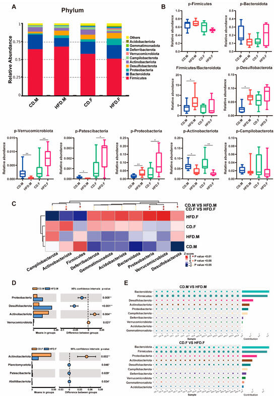 Phylum-level relative abundance of gut microbiota. (A) The stacked column graph displays the top 10 phyla with the highest relative abundance. (B) The effects of an HFD on the relative abundances of several intestinal flora were analyzed at the phylum level using box plots. (C–E) Through employing t-tests, Metastable complex heat maps, and Simper tests, we conducted an analysis at the phylum level to investigate the impact of an HFD on the composition of the gut microbiota. * indicates p-value < 0.05, ** indicates p-value < 0.01 (t-test).
