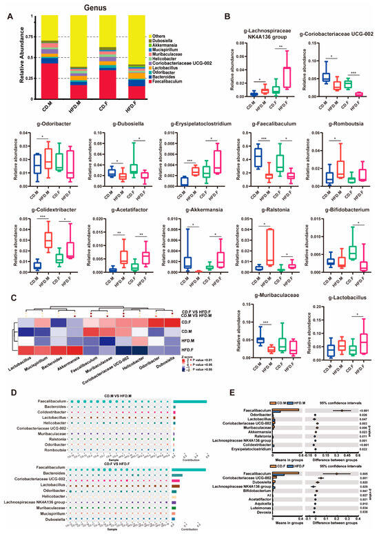 Genus-level relative abundance of gut microbiota. (A) The stacked column graph displays the top 10 genera with the highest relative abundance. (B) The effects of an HFD on the relative abundances of several intestinal flora were analyzed at the genus level using box plots. (C–E) Through employing t-tests, Metastable complex heat maps, and Simper tests, we conducted an analysis at the genus level to investigate the impact of an HFD on the composition of the gut microbiota. * indicates p-value < 0.05, ** indicates p-value < 0.01, *** indicates p-value < 0.001 (t-test).