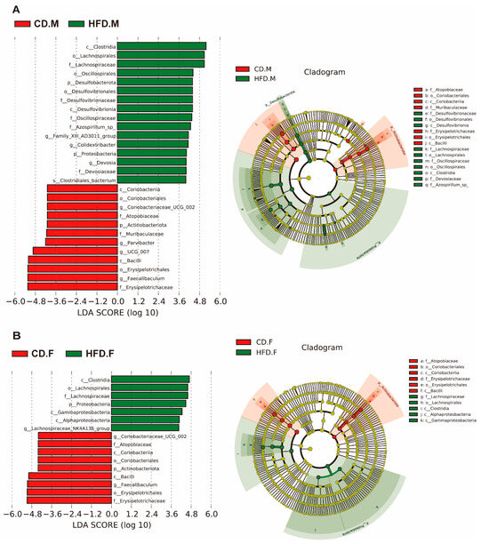 The identification of functional biomarkers using linear discriminant analysis effect size (LEfSe). (A) The intestinal microbiota in male mice subjects was subjected to LEfSe analysis. (B) The intestinal microbiota in female mice subjects was subjected to LEfSe analysis.