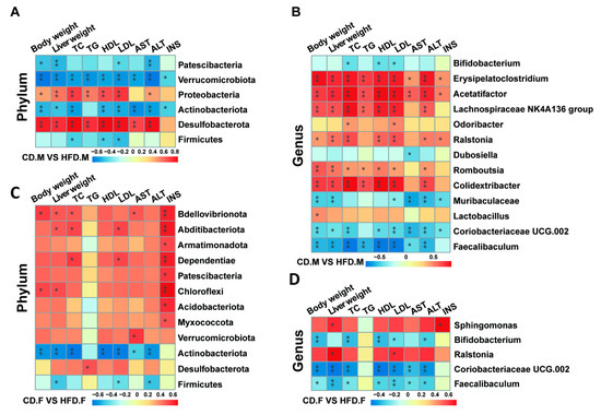Integrated analysis of gut microbiota composition and NAFLD-associated markers. (A) Differential bacteria at phylum level in male group. (B) Differential bacteria at genus level in male group. (C) Differential bacteria at phylum level in female group. (D) Differential bacteria at genus level in female group. Spearman rank correlations were determined between the altered gut microbiota and serum levels of TG, TC, AST, ALT, INS, LDL-C, and HDL-C. The color red indicates a positive correlation while blue represents a negative correlation. Significant correlations are indicated by * p-value < 0.05, ** p-value < 0.01 marked with asterisks.
