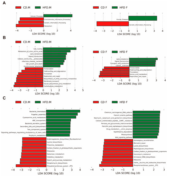 The function of gut microbiota was predicted using PICRUSt2 based on 16S rDNA sequences. To further investigate discrepancies in KEGG pathways among distinct groups, LEfSe was used to find differences in KEGG pathway abundances (Figure 7A–C). PICRUSt2 analysis showed that the functional genes predicted for gut microbiota after HFD intervention in the male group could be annotated to 4 primary pathways, 16 secondary pathways, and 19 tertiary pathways in the KEGG database. However, the female group could intervene in 2 primary pathways, 9 secondary pathways, and 20 tertiary pathways. In the HFD-induced male group, the most abundant pathways were related to cellular processes, metabolism, genetic information processing, and environmental information processing. The results of secondary prediction pathways showed that most of the predicted genes of cellular processes pathway were involved in cell motility, cell growth and death, and cellular community—prokaryotes. Further refining the cell motility pathway, an HFD upregulated the bacterial chemotaxis and flagellar assembly pathways. Most of the predicted genes in metabolic pathways are involved in metabolism of other amino acids, carbohydrate metabolism, glycan biosynthesis and metabolism, and lipid metabolism-related pathways. Further refinement revealed that HFD upregulated the cyanoamino acid metabolism, secondary bile acid biosynthesis, and fatty acid biosynthesis pathways and downregulated starch and sucrose metabolism, galactose metabolism, histidine metabolism, thiamine metabolism, and other metabolic pathways. In the female group, the identified bacterial genes may be associated with human diseases and genetic information processing, and the results of secondary prediction pathways showed that most of the predicted genes in the genetic information processing pathway were involved in replication and repair, translation, and transcription-related pathways, further refining our observation that an HFD inhibited the ribosome- and DNA replication- related pathways. Through analyzing the data of male and female groups, we found that HFD significantly inhibited the pathways of phosphotransferase system-PTS and ribosome.