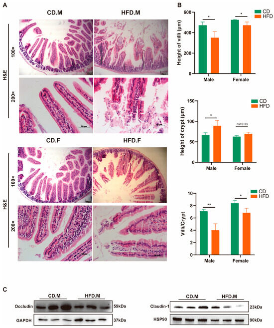 The presence of NAFLD has been associated with dysbiosis in the gut microbiota, inflammation, and impairment of the intestinal barrier. Histological analysis using H&E staining revealed that male and female mice fed with an HFD exhibited disruption of the epithelial layer, the presence of abscesses, increased edema, and cellular infiltration into the submucosal layer (Figure 8A). Furthermore, HFD mice showed a significant decrease in villus height (p < 0.05) and a significant increase in crypt depth (p < 0.05) in the cecum. Additionally, the ratio of villus height to crypt depth (V/C value) significantly decreased (p < 0.05) (Figure 8B), which is an important indicator of intestinal villus integrity and digestion and absorption capabilities. Meanwhile, HFD mice showed a significant decreased expression of the tight junction protein Occludin (Figure 8C). The results indicate that an HFD could affect the integrity of the intestinal epithelium, leading to changes in intestinal permeability and damage to the defense mechanisms of the intestinal mucosa.