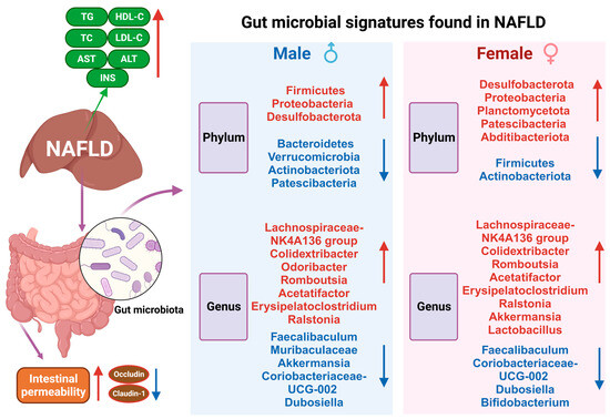 Gut microbial signatures found in NAFLD. The red arrows depict the upregulated gut microbes, while the blue arrows represent the down-regulated gut microbes.
