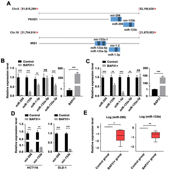 Regulation of the miR-206/133b cluster is associated with BAP31 expression levels in CRC cells and tumor tissues. (A) Schematic diagram demonstrating the locations of the miR-206/133b and miR-133a-1/1-2 clusters. The expressed sequence tag transcripts were identified in the UCSC database. Light blocks indicate the position of miRNA precursors, and dark blocks indicate the position of miRNA matures. (B,C) qPCR analysis of the expression of the miR-206/133b cluster and the miR-133a-1/1-2 cluster in HCT116 (B) and DLD-1 (C) with BAP31 overexpression. (D) qPCR analysis of expression of miR-206/133b cluster precursors in HCT116 and DLD-1 cells. (E) qPCR analysis of the expression of miR-206 and miR-133b in CRC xenograft tumors. Data are represented as the mean ± SD of three independent experiments. * p < 0.05, ** p < 0.01, *** p < 0.001, and ns indicates non-significance.