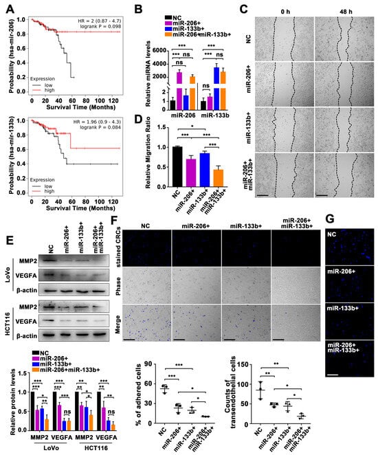 Manipulation of the miR-206/133b cluster affects transendothelial cell migration in CRC cells. (A) Kaplan−Meier curves demonstrate the overall survival of patients with rectal adenocarcinoma for mir-206 and mir-133b cases selected with high expression versus low expression cases. (B) qPCR analysis of the expression of miR-206 and miR-133b in LoVo cells with transfection of miRNA mimics. (C,D) Wound healing assays demonstrate the effect of miR-206 and miR-133b on enhancing the migration effect of LoVo cells (Scale bar, 100 μm). (E) Western blot analysis of related protein expression reflecting the effect of miR-206 and miR-133b in LoVo cells and HCT116 cells. (F) Adhesion assays analyzed the effect of miR-206 and miR-133b in LoVo cells. The representative microscopic images demonstrate the phase contrast of Hoechst33342-stained LoVo cells (top panel) remaining on the layer of HUVECs (middle panel) after multiple washes (Scale bar, 100 µm). (G) Transendothelial migration assays demonstrate the effect of miR-206 and miR-133b in LoVo cells. The representative microscopic images demonstrate the phase contrast of the Hoechst33342-stained LoVo cells (blue) during transmigration through an endothelial barrier (Scale bar, 50 µm). Data are represented as the mean ± SD of three independent experiments. * p < 0.05, ** p < 0.01, *** p < 0.001, and ns indicates non-significance.