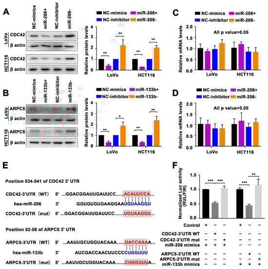 Targets of the miR-206/133b cluster are predicted and identified in CRC cells. (A) Western blot analysis of CDC42 protein expression, reflecting the effect of miR-206 in LoVo and HCT116 cells. (B) Western blot analysis of ARPC5 protein expression, reflecting the effect of miR-133b in LoVo and HCT116 cells. (C) qPCR analysis of CDC42 mRNA expression, reflecting the effect of miR-206 in LoVo and HCT116 cells. (D) qPCR analysis of ARPC5 mRNA expression, reflecting the effect of miR-133b in LoVo and HCT116 cells. (E) Schematic diagram showing wild-type (WT) and mutation (mut) sequences of CDC42 3′UTR binding sites matching for miR-206, and wild-type (WT) and mutation (mut) sequences of ARPC5 3′UTR binding sites matching for miR-133b. (F) Luciferase activity reporter showing the miR-206 binding effect to wild-type (WT) and mutation (mut) sequences of the CDC42 3′-UTR, and the miR-133b binding effect to wild-type (WT) and mutation (mut) sequences of the ARPC5 3′-UTR. Data are represented as the mean ± SD of three independent experiments. * p < 0.05, ** p < 0.01, and *** p < 0.001.