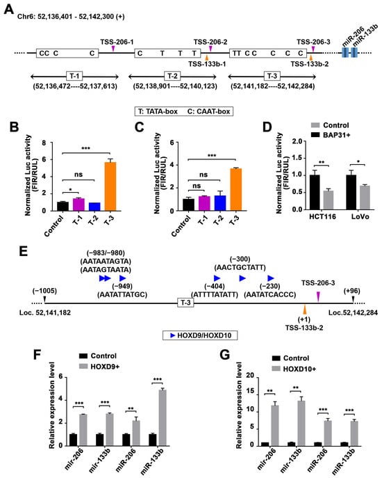 miR-206/133b cluster transcription factors are predicted and identified in CRC cells. (A) Schematic diagram demonstrating three regions containing potential TSSs of the miR-206/133b cluster. The cis-acting regulatory DNA elements (TATA-box and CAAT-box) are demonstrated within the motif on the plus strand. Light blocks indicate the position of miRNA precursors, and dark blocks indicate the position of miRNA matures. (B,C) Luciferase activity reporter showing the initiating transcription of three genomic fragments (T-1, T-2 and T-3 regions) in HCT116 (B) and LoVo cells (C). (D) Luciferase activity reporter showing the initiating transcription of the T-3 region, reflecting BAP31 expression in LoVo and HCT116 cells. (E) Schematic diagram demonstrating the HOXD9 and HOXD10 binding sites within the T-3 region motif on the plus strand. (F,G) qPCR analysis of the expression of miR-206/133b cluster precursors and matures, reflecting the effect of HOXD9 (F) and HOXD10 (G) in HCT116 cells. Data are represented as the mean ± SD of three independent experiments. * p < 0.05, ** p < 0.01, *** p < 0.001, and ns indicates non-significance.