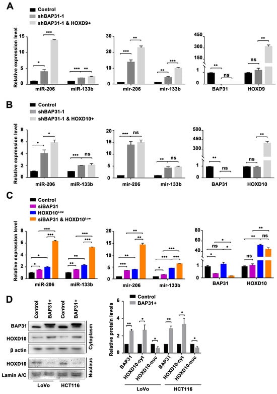 BAP31 manipulates the transcriptional activation of the miR-206/133b cluster by HOXD10. (A) qPCR analysis of the expression of miR-206/133b cluster matures and precursors, reflecting the effect of BAP31 and HOXD9 in HCT116 cells. (B) qPCR analysis of the expression of miR-206/133b cluster matures and precursors, reflecting the effect of BAP31 and HOXD10 in HCT116 cells. (C) qPCR analysis of the expression of miR-206/133b cluster matures and precursors, reflecting the effect of BAP31 and HOXD10 in HCT116 cells. (D) Western blot analysis of the expression of HOXD10 gene in the cytoplasm and nucleus fractions, reflecting the effect of BAP31 in HCT116 and LoVo cells. Data are represented as the mean ± SD of three independent experiments. * p < 0.05, ** p < 0.01, *** p < 0.001, and ns indicates non-significance.