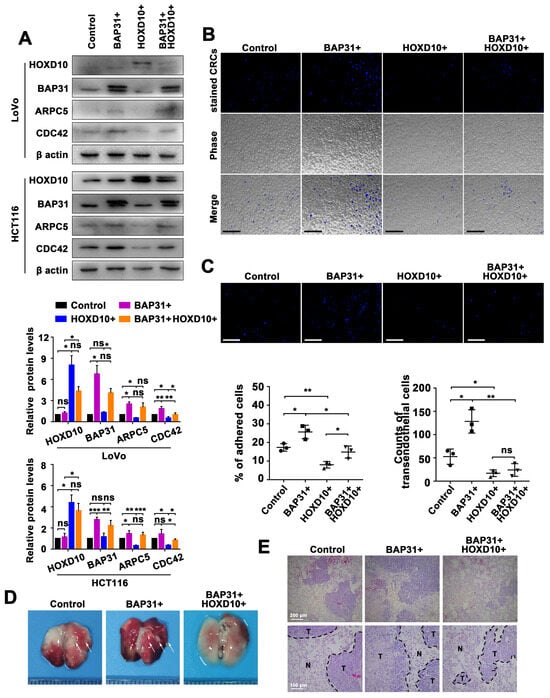 The BAP31/HOXD10 axis manipulates CDC42 and ARPC5 to affect tumor metastasis in vitro and in vivo. (A) Western blot analysis of the expression of CDC42 and ARPC5 genes in HCT116 and LoVo cells, reflecting the effect of the BAP31 and HOXD10 genes. (B) Adhesion assay results for the effect of BAP31 and HOXD10 in LoVo cells. The representative microscopic images demonstrate the phase contrast of Hoechst33342-stained LoVo cells (top panel) remaining on the layer of HUVECs after multiple washes (Scale bar, 100 µm). (C) Transendothelial migration assay results for the effect of BAP31 and HOXD10 in LoVo cells. The representative microscopic images demonstrate the phase contrast of the Hoechst33342-stained LoVo cells (blue) during transmigration through an endothelial barrier (Scale bar, 50 µm). (D) Colorectal cancer lung metastasis regulated by BAP31 and HOXD10 expression in nude mice. The arrowheads indicate visible metastatic tumors. (E) Representative H&E-stained lung sections prepared from recipient mice bearing CRC cells regulated by BAP31 and HOXD10 expression. N, normal lung tissue; T, metastatic tumor. Data are represented as the mean ± SD of three independent experiments. * p < 0.05, ** p < 0.01, *** p < 0.001, and ns indicates non-significance.