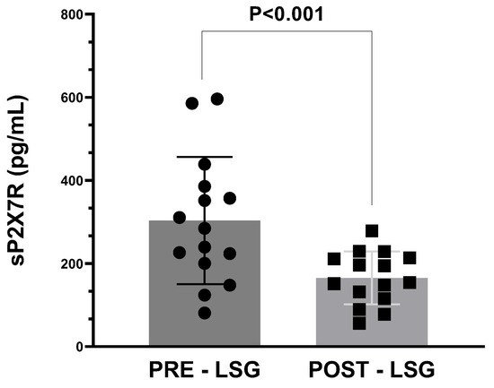 Similarly, sP2X7R plasma levels were also significantly reduced in obese subjects after weight loss via bariatric surgery (p < 0.001, Figure 1).