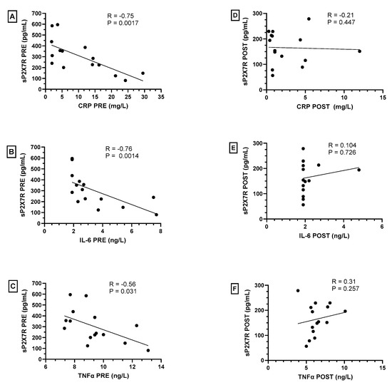 Spearman’s correlations between plasma levels of shed P2X7 receptor (sP2X7R) with C-reactive protein (CRP), IL-6 and TNFα in obese subjects before (PRE—(A–C)) and after (POST—(D–F)) bariatric surgery. A p-value < 0.05 was considered statistically significant.