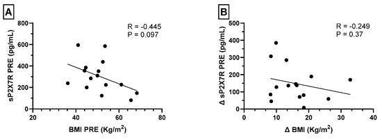 (A) Spearman’s correlations between plasma levels of shed P2X7 receptor (sP2X7R) and BMI before bariatric surgery. (B) Spearman’s correlations between the difference in sP2X7R and BMI values before and after surgery (∆sP2X7R and ∆BMI, respectively). A p value < 0.05 was considered statistically significant.