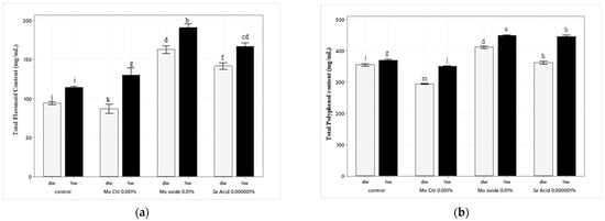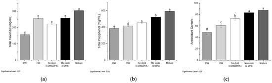 Meanwhile, as shown in Figure 4b,c, the optimal concentrations of Mo oxide-HW resulted in a 13% increase in total polyphenol levels and a 43% increase in antioxidant levels when compared to the control group. Similarly, appropriate Se acid-HW concentrations resulted in a 6% increase in total polyphenol levels and a 33% increase in antioxidant levels. On the other hand, the mixture of both trace elements treated with HW at the optimal concentration increased the secondary metabolites to a greater level. The rate of total flavonoid and total polyphenol increased by mixture treatment is 42.4% and 19.5%, respectively, as compared to DW, as well the antioxidant content is also increased by 47% by mixture treatment.