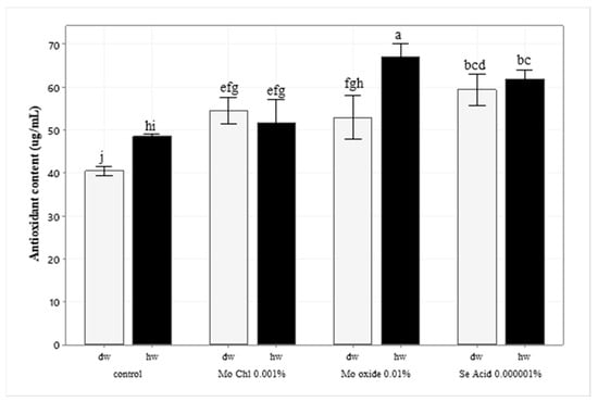 The DPPH (2,2-diphenyl-1-picrylhydrazyl) assay is based on the assessment of the scavenging capacity of antioxidants. In this study, the radical scavenging activities of the Mo oxide and Se acid-HW treatments are relatively higher in comparison with the control and compared to when they were treated with DW (p < 0.05). They increased the antioxidant capacity by 38% and 35%, accordingly, as compared to control, as illustrated in Figure 2. However, the Mo oxide-DW and Se acid-DW treatments increased the antioxidant content by 23% and 32%, respectively, as compared to the control group. On the other hand, no significant difference was observed following the application of Mo chloride 0.001% treated with HW and distilled water, though a slight increase was noticed as compared to the control.