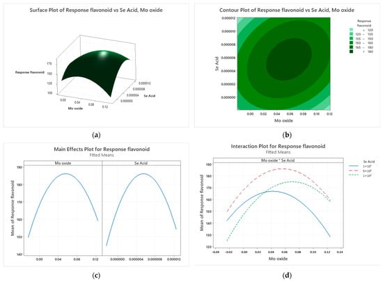 RSM model: (a) 2D surface plot, (b) 3D contour plot, (c) factorial plot, and (d) interaction plot (* represents the interaction between Se acid and Mo oxide);the total flavonoid response (mg/mL) affected by Se acid and Mo oxide treated with HW (α = 0.05). The blue, green, and red lines represent the interaction at different concentrations of Se acid and Mo oxide. The factorial plot, meanwhile, depicts the optimal concentration ranges of each treatment and interaction plot indicating the significant interaction between trace elements.